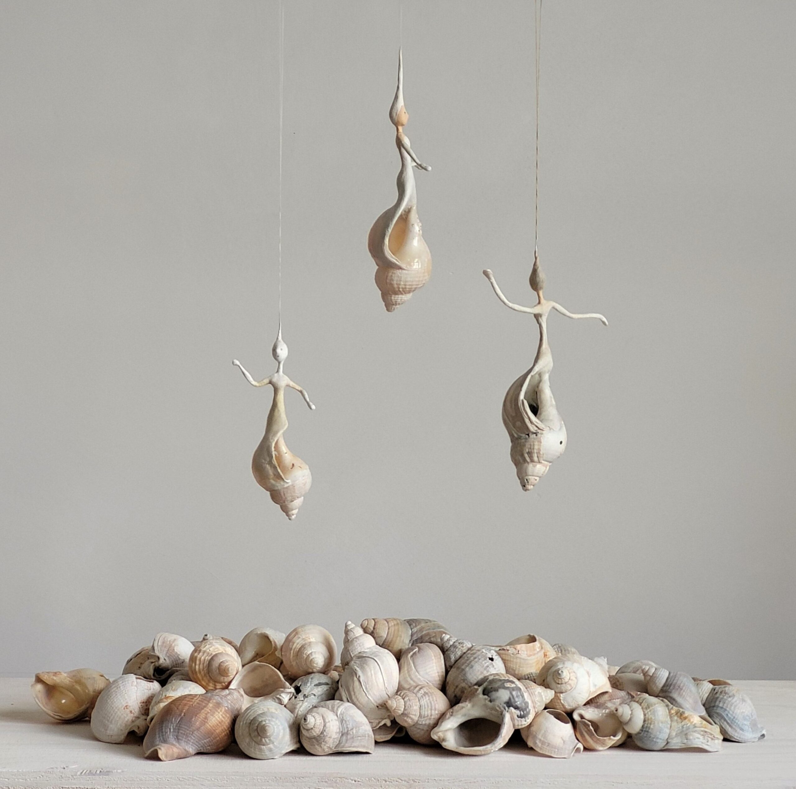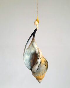 Ik maak objecten van natuurlijk materiaal dat op het strand aanspoelt. In het bijzonder wulken, die door jarenlange zwerftochten over de zanderige zeebodem wonderlijk gekleurd en versleten zijn, breng ik weer tot leven, soms met een aanvulling die verwijst naar de lokale geschiedenis. Mijn‘schelpenvrouwen’ zijn een volstrekt eigen vinding en sluiten qua beeldtaal aan bij mijn eerdere werk.