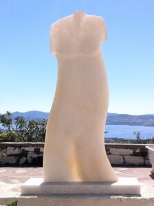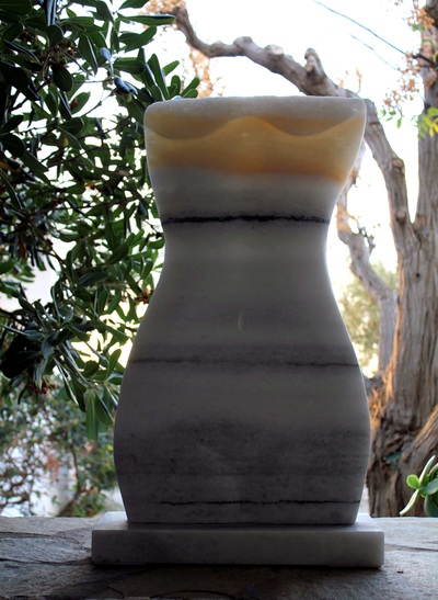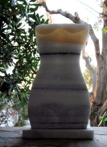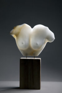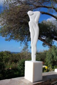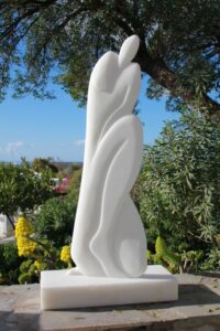 Mijn beelden dragen “het eeuwig vrouwelijke” in zich. Zij vertegenwoordigen mijn communicatie met de steen, de lijnen en structuren die zijn ontstaan door de tijden en de steen haar eigen taal geeft.